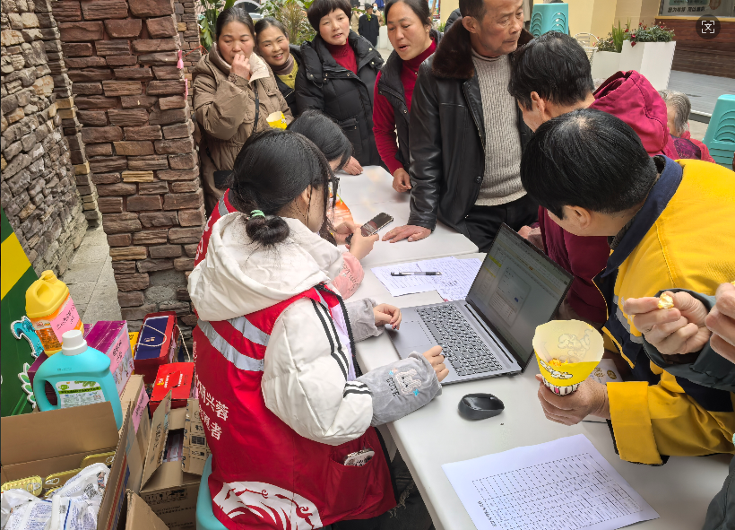 活动现场气氛热烈,居民们对兑换流程已十分熟悉。大家在工作人员的协助下查询积分、挑选礼品,有序完成兑换。社区网格员和社工也耐心为居民介绍积分规则和可兑换商品目录,其中一位居民黎嬢嬢凭借153.2分的积分,成功兑换了电火锅及抽纸等日常用品。